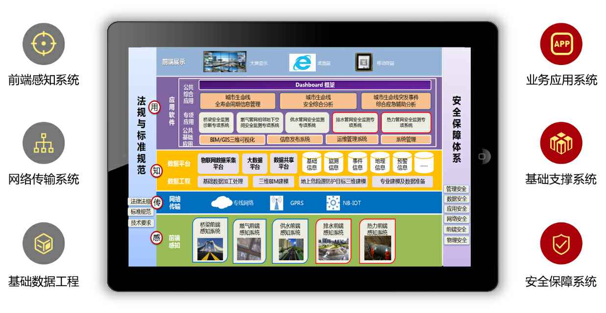 合肥市城市生命线工程安全运行监测系统项目包括桥梁安全、燃气管网、供水管、排水管网和热力管网,按照统筹规划、顶层设计、资源共享、集约建设的总体建设原则,“点、线、面”相结合方式进行成果应用扩展,打造合肥市城市生命线工程公共基础设施安全运行综合支撑平台,创新城市管理模式,做到3个“统一”(统一标准、统一监管、统一服务),4个“全面”(全面感知、全面接入、全面监控、全面预警),5个“落地”(风险可视化、监管规范化、运行透明化、管理精细化、保障主动化)的建设目标。