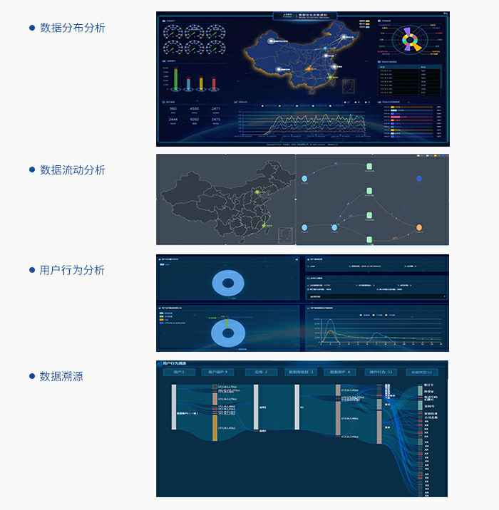 展现敏感数据访问量最多的TOP10应用、敏感数据访问量最多的TOP10数据类型、敏感数据访问量最多的TOP10用户和敏感数据访问量最多的TOP10IP及敏感数据流动地图等。可通过直观的数据流向地图展现数据的真实流转情况。